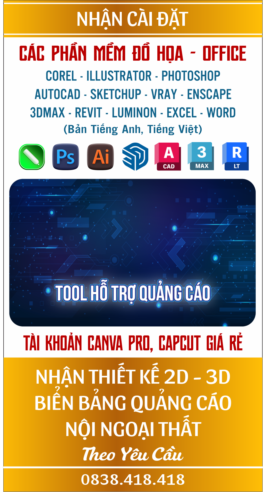 Nhận Thiết Kế: 2D, 3D Biển Bảng Quảng Cáo Nội - Ngoại Thất Theo Yêu Cầu. Hỗ Trợ Cài Đặt Các Phần Mềm Đồ Hoạ: Corel, Photoshop, Illustrator, SketchUp, Vray, Enscape, AutoCAD, Adobe Premier / Tool Hỗ Trợ Quảng Cáo / Cài Driver Tất Cả Các Loại Máy In - Photo, Máy Cắt Decal. Hotline Zalo: 0838.418.418 UY TÍN CHẤT LƯỢNG Nhận Thiết Kế: 2D, 3D Biển Bảng Quảng Cáo Nội - Ngoại Thất Theo Yêu Cầu. Hỗ Trợ Cài Đặt Các Phần Mềm Đồ Hoạ: Corel, Photoshop, Illustrator, SketchUp, Vray, Enscape, AutoCAD, Adobe Premier / Tool Hỗ Trợ Quảng Cáo / Cài Driver Tất Cả Các Loại Máy In - Photo, Máy Cắt Decal. Hotline Zalo: 0838.418.418 UY TÍN CHẤT LƯỢNG Nhận Thiết Kế: 2D, 3D Biển Bảng Quảng Cáo Nội - Ngoại Thất Theo Yêu Cầu. Hỗ Trợ Cài Đặt Các Phần Mềm Đồ Hoạ: Corel, Photoshop, Illustrator, SketchUp, Vray, Enscape, AutoCAD, Adobe Premier / Tool Hỗ Trợ Quảng Cáo / Cài Driver Tất Cả Các Loại Máy In - Photo, Máy Cắt Decal. Hotline Zalo: 0838.418.418 UY TÍN CHẤT LƯỢNG